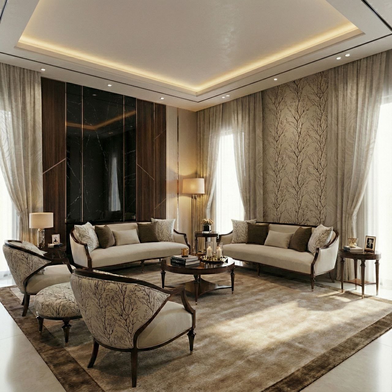 A refined living set in soft ivory tones, blending classic charm with modern efficiency for a graceful centerpiece.
