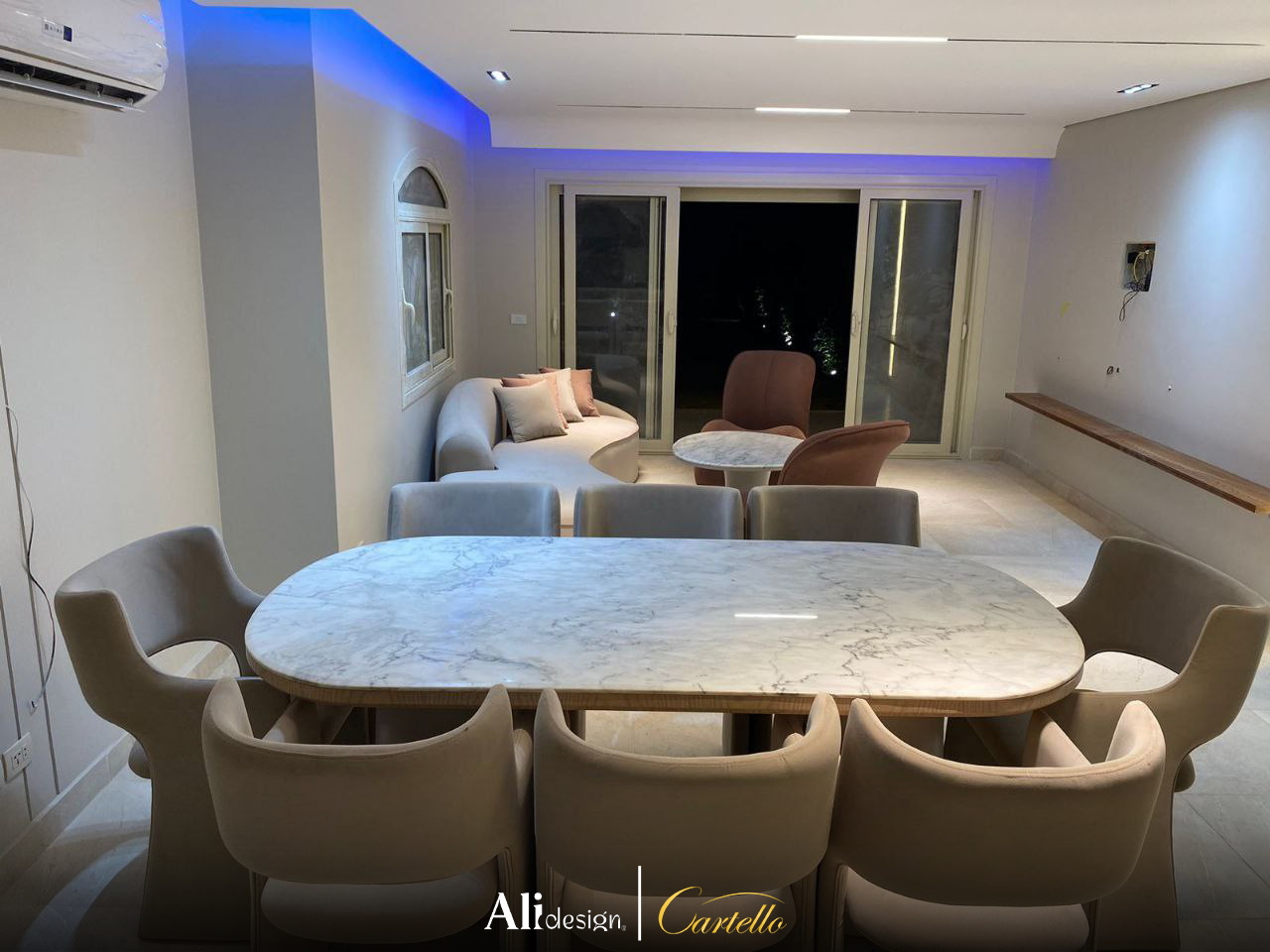 blending soft curves with high-end textures. The centerpiece is an expansive, oval-shaped dining table featuring a premium white marble top with delicate grey veining.