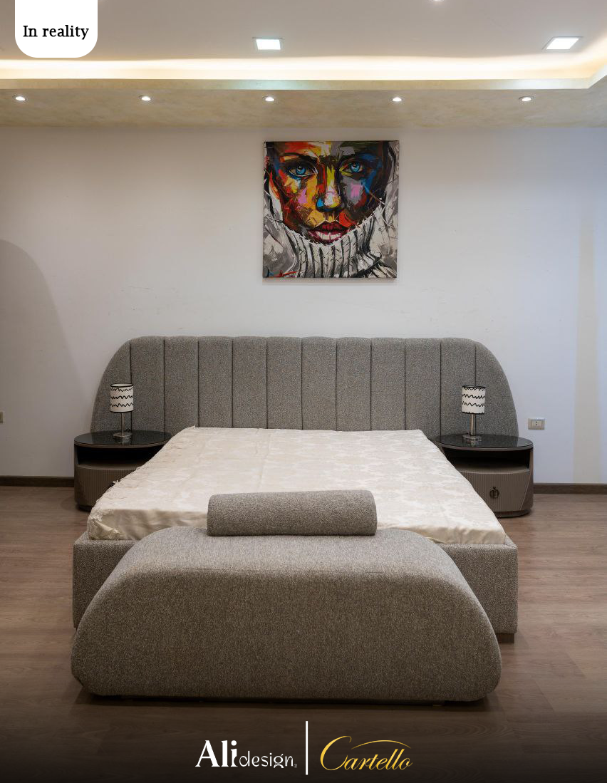 Product Arabic Short Description: يجسد هذا السرير الفخامة الكلاسيكية الحديثة بظهره المنحني للأمام (Wingback) وتنجيده المخملي الفاخر. يأتي الطقم مع أريكة جانبية (Ottoman) بنفس التصميم المنحني لتكتمل أناقة جناح النوم الرئيسي.